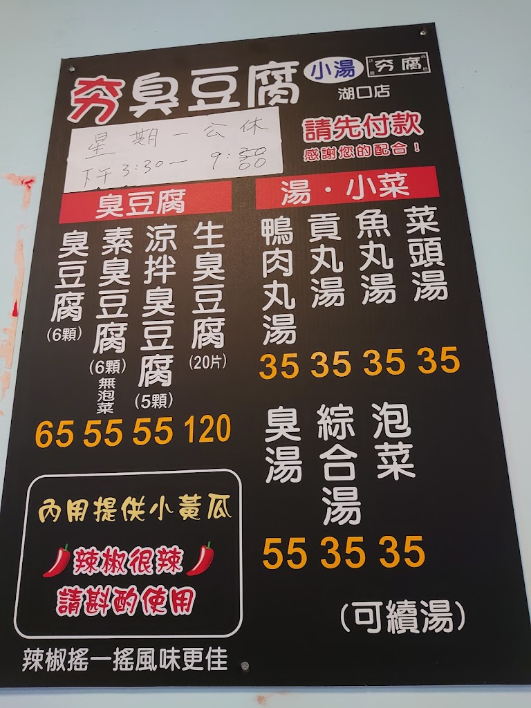 夯臭豆腐新竹店,產品就臭豆腐(60),泡菜單買一份35元。 湯品(摃丸、魚丸、菜頭、綜合)一律35元。 冰櫃有飲料、啤酒,有標價,比一般零售價高。 臭 ...